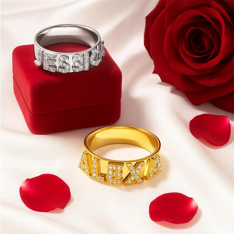 Custom Name Ring | Sterling Silver Block Letter Ring with Zirconia | Personalized Gold Initial Promise Ring for Her