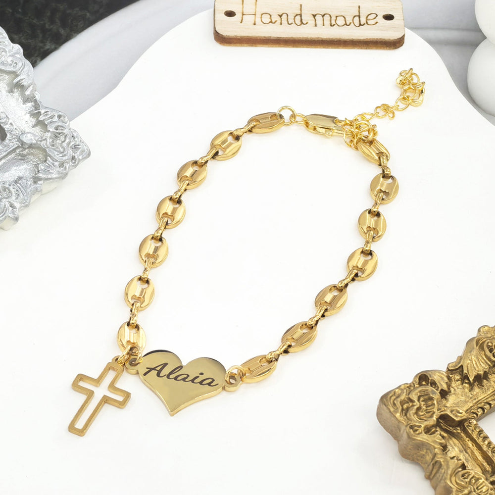 Engravable Pig Nose Chain Name Bracelet with Heart & Cross Charm – ASTM-Safe Girls Gift