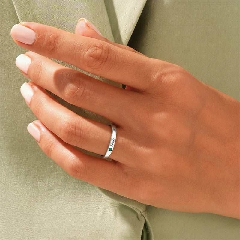 Crafted in sleek silver, this personalized ring features one custom birthstone, with the option to engrave a name on the outer band and a special message on the inner band — creating a keepsake that is both elegant and emotional.