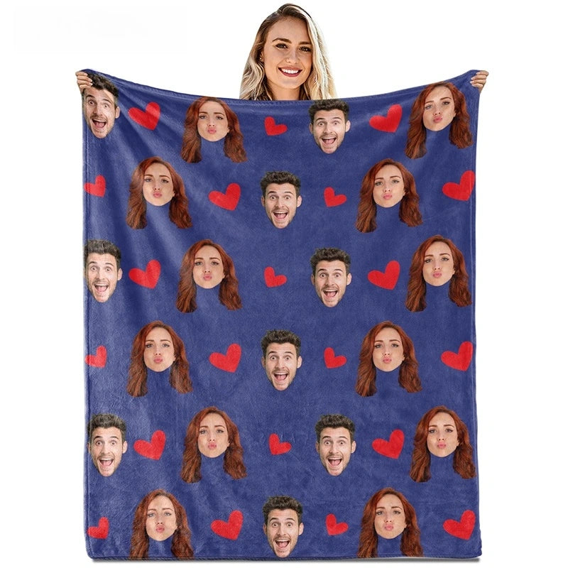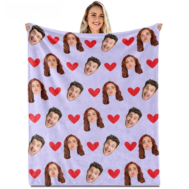 Custom Face Blanket with Hearts – Personalized Photo Blanket for Couples, Valentine’s Day Gift for Him or Her