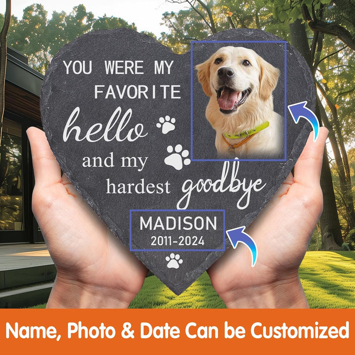 Crafted from premium polished stone, this heart-shaped pet memorial combines elegance and durability. Customizable with your pet’s name, photo, and dates, it features fade-resistant, high-definition engraving to honor their memory. Designed for both indoor (mantels, shelves) and outdoor (gardens, kennels) use, its weather-resistant material ensures lasting beauty. The heartfelt inscription, “You were my favorite and my hardest goodbye,” offers comfort, turning grief into a timeless tribute.