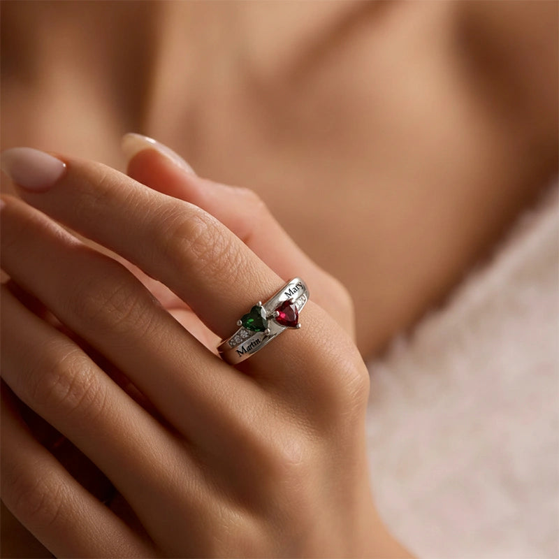 Featuring two heart-shaped birthstones side by side, this ring symbolizes connection, love, and togetherness. Personalize it with 2 engraved names and an optional inside engraving message, making it a truly one-of-a-kind keepsake for someone special.