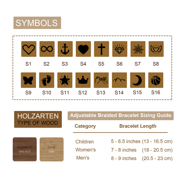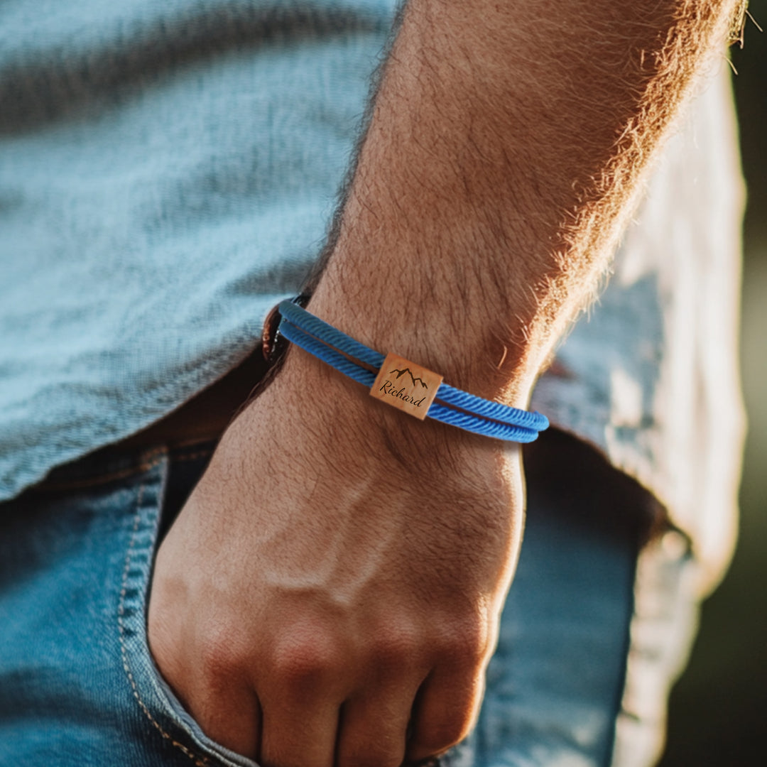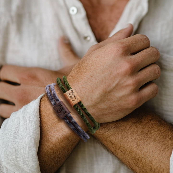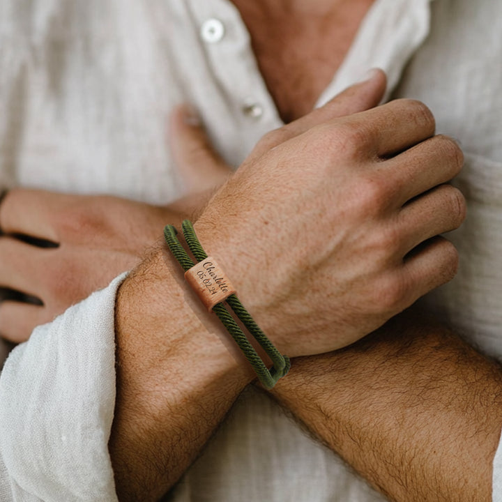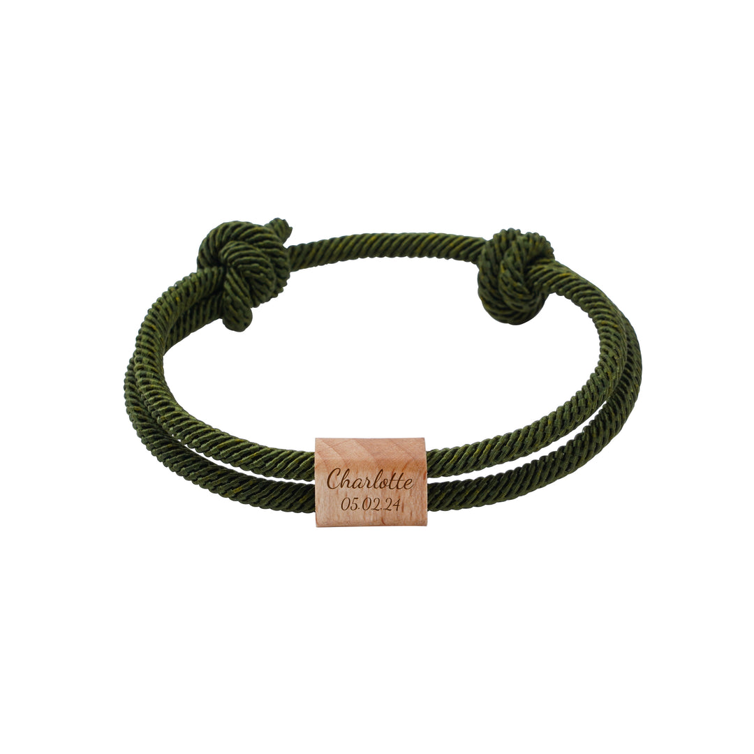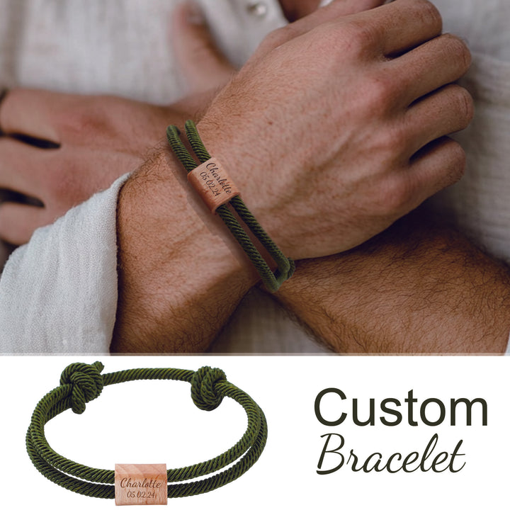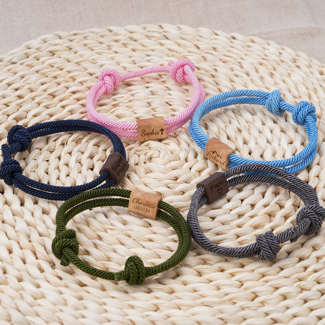 The wooden slider adds a natural, timeless touch, while the personalized engraving makes every bracelet one-of-a-kind—your story captured in wood and cord.