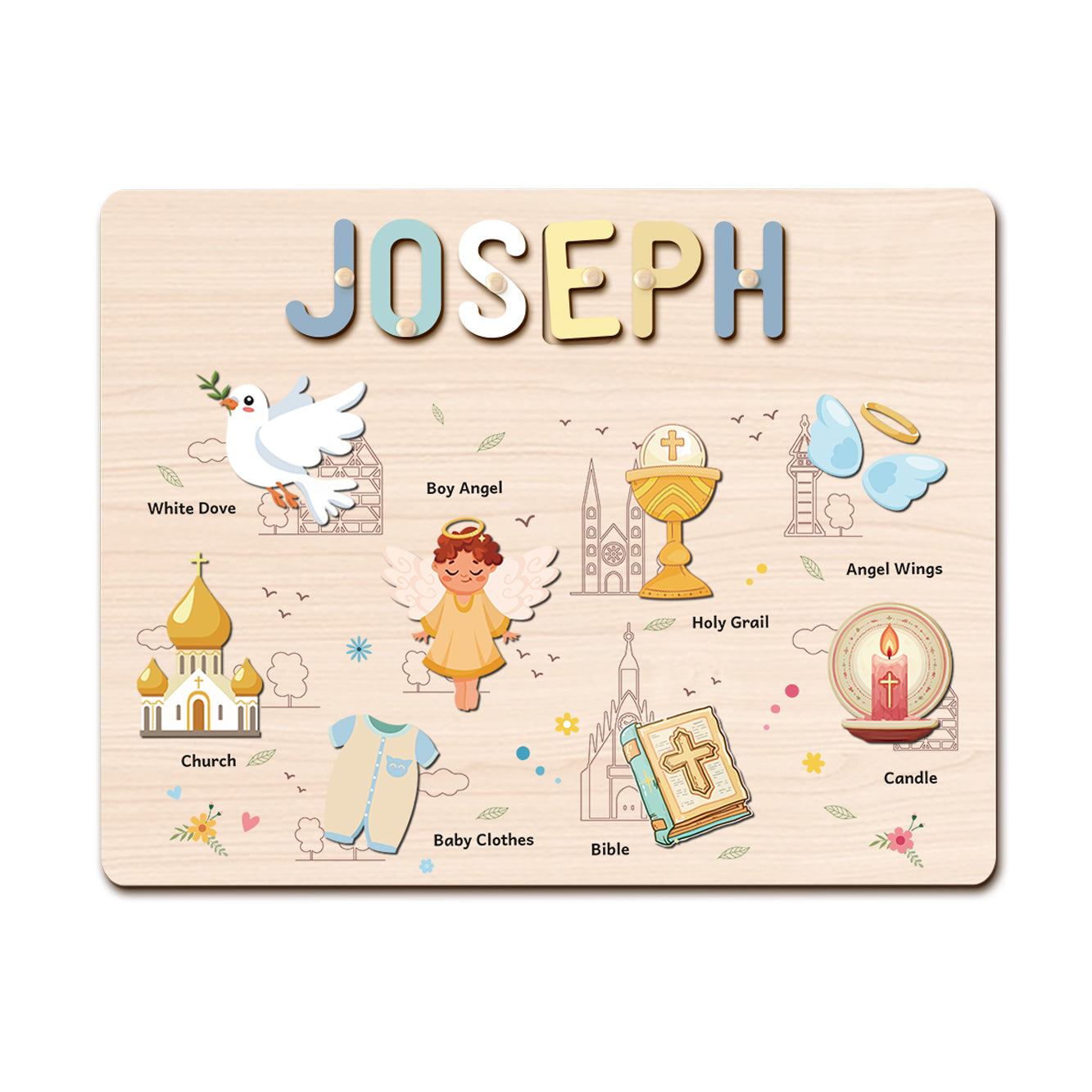 Make her christening day extra special with a Personalized Baby Boy Christening Name Puzzle! Featuring soft pastel icons like doves, crosses, hearts, and angels, this handcrafted wooden puzzle is both a meaningful keepsake and an engaging educational toy. Personalize it with her name for a one-of-a-kind baptism gift that will be treasured for years to come.