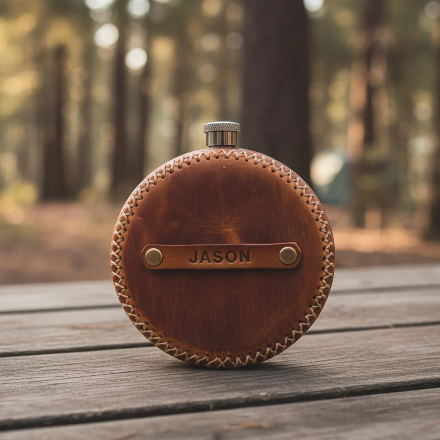 Personalized Leather Round Hip Flask – Custom Engraved Camping Flask, Groomsmen Gift, Whiskey Flask for Him