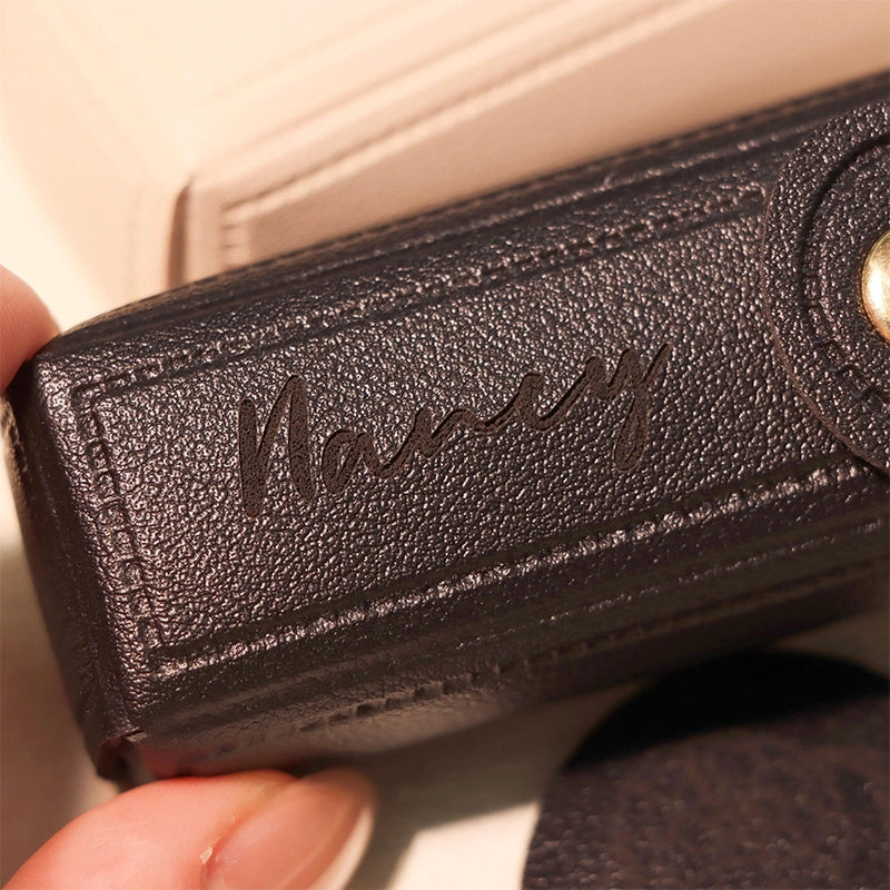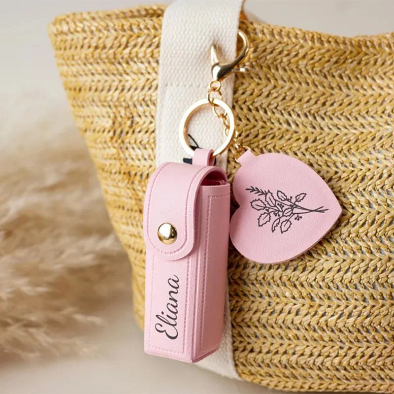 Crafted from premium PU leather and customized with your name, this mini lipstick case combines style, function, and personalization in one elegant accessory. The built-in mirror makes quick touch-ups effortless, while the keychain design lets you clip it to your handbag, keys, or wrist strap — no more digging through your bag for lip products.
