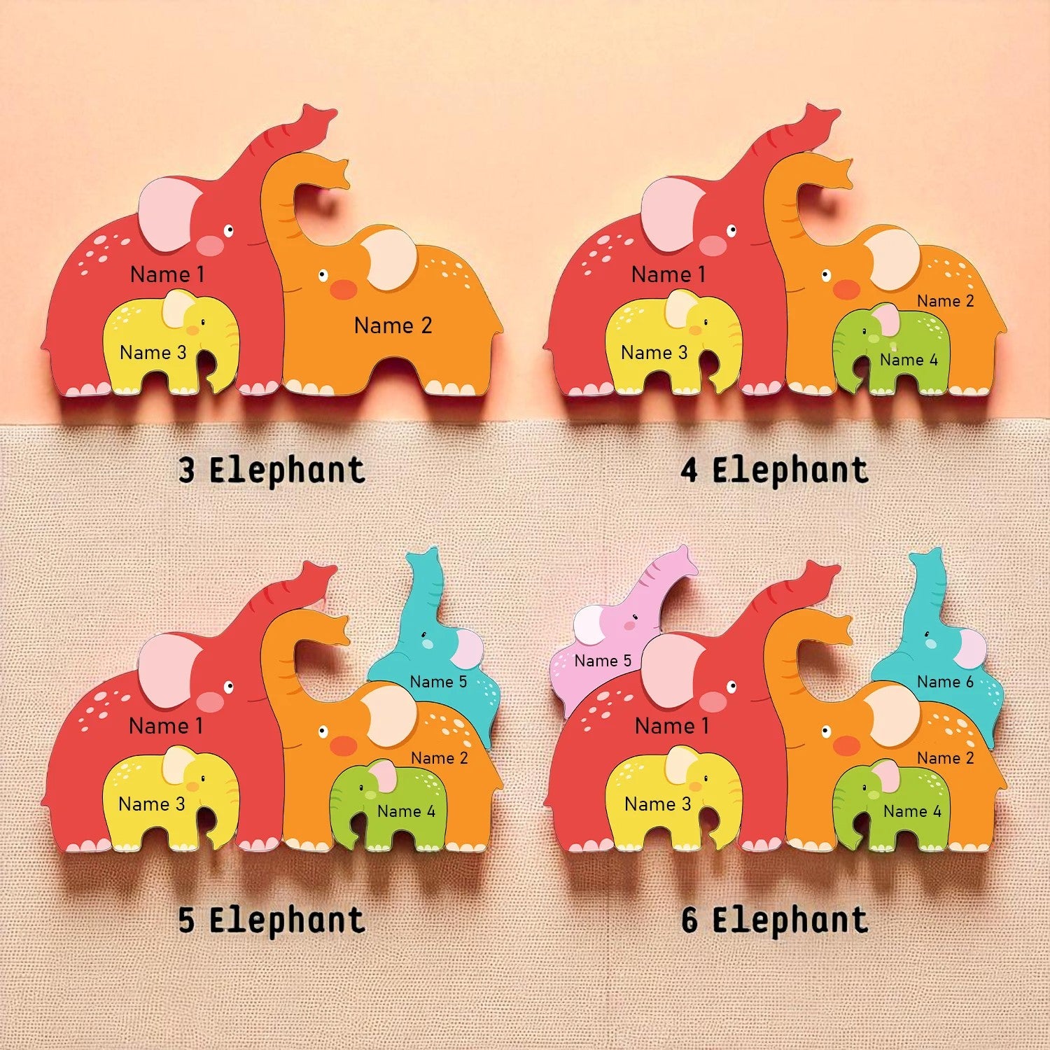 Celebrate the love of family with our Personalized Elephant Family Name Puzzle, a beautifully handcrafted wooden puzzle featuring up to 6 elephants customized with your chosen names. Perfect as a Montessori learning toy, a sentimental keepsake, or charming nursery décor, this puzzle blends fun, education, and family connection.