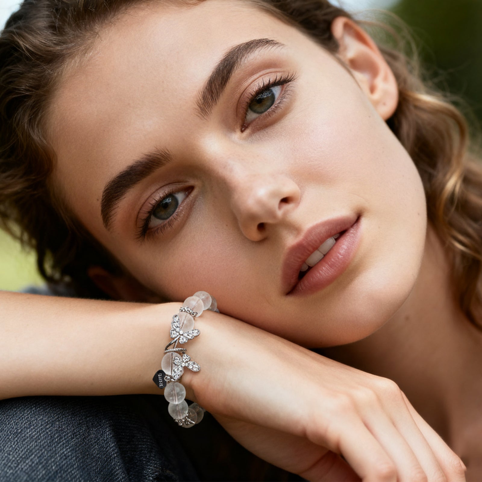 Halloween is the season to embrace your hidden dark romance. This Gothic Butterfly Custom Name Bracelet captures that spirit with translucent white crystal beads and three gunmetal-plated copper butterflies. Subtle, ritualistic, and deeply personal, it’s the perfect accessory for those who prefer understated Gothic elegance over flashy festivity.